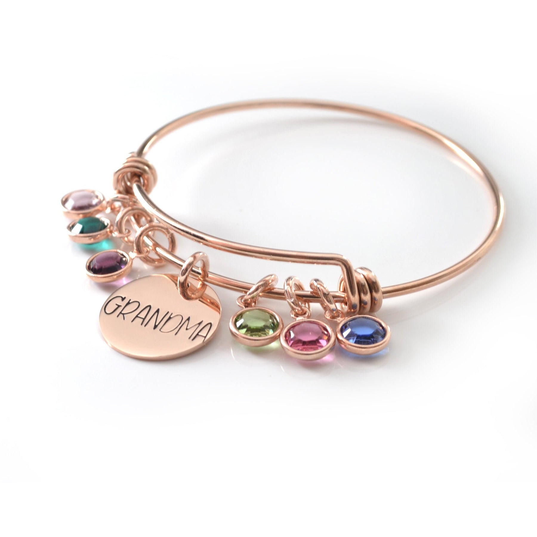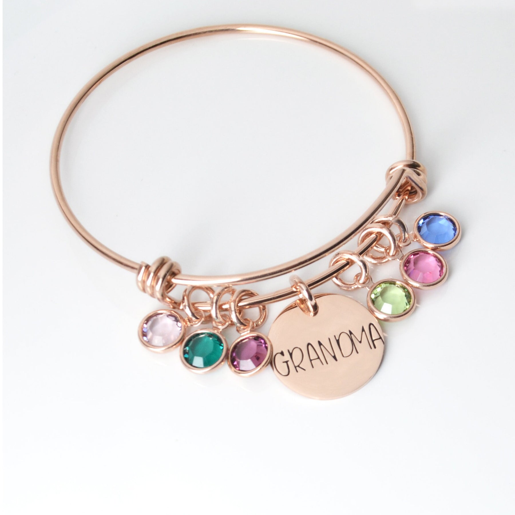 This bangle features a coin personalized with up to 7 characters, perfect for Mother's Day! Add a birthstone charm for each grandchild to create a memorable gift for Grandma, Nana, Grammie, Mom, Auntie, etc.