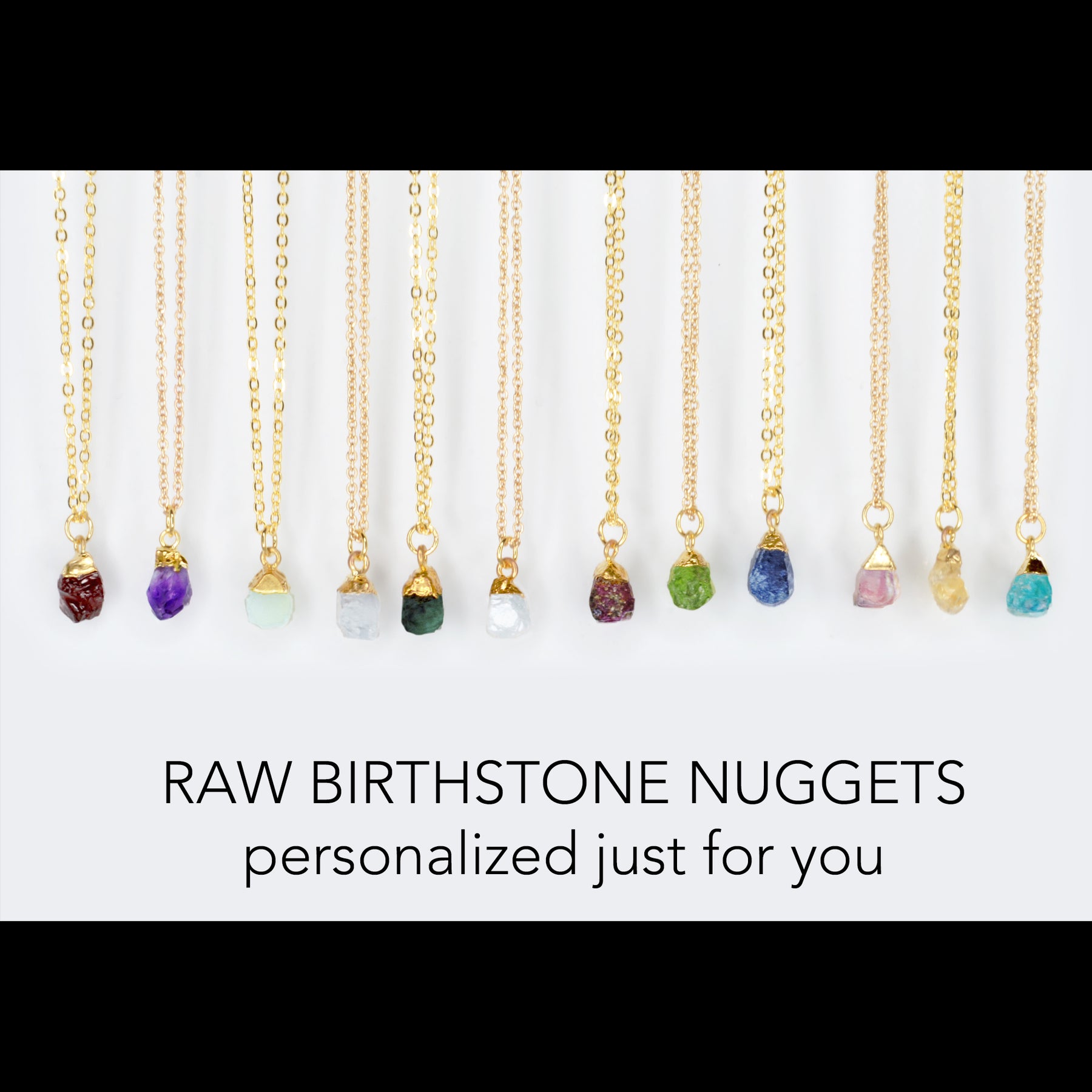 These one of a kind birthstone necklaces are made from rough cut raw gemstones. Each personalized raw birthstone necklace features a stone or stones from birthday months of your choosing and is unique in its size, shape, color variations and texture.